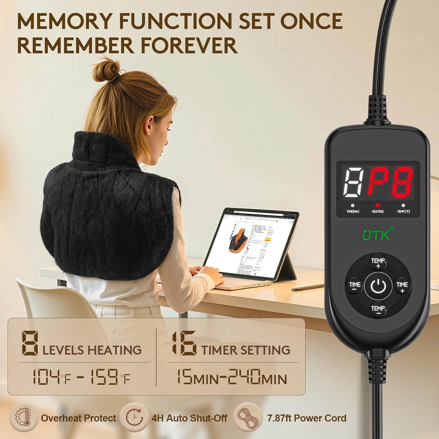 - Easy to Use: Designed for simplicity, this weighted heating pad offers 8 temperature settings (104°F-159°F) and 16 timer options (15min-240min), delivering personalized comfort at your fingertips. Safety is prioritized with auto shut-off (4-hour cutoff) and overheat protection. The memory function retains your last-used settings—no need to readjust, making it ideal for seniors. Plus, the 7.87ft extra-long power cord ensures flexible placement without outlet restrictions