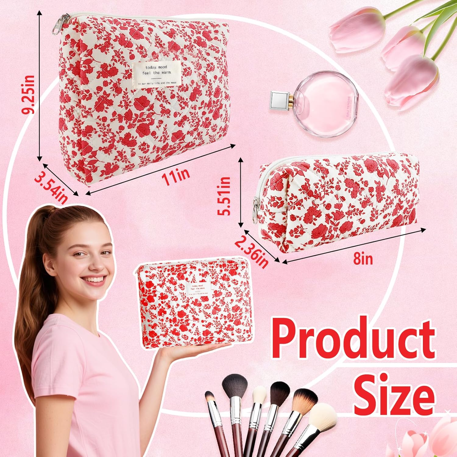 2Pcs Quilted Makeup Bag Set Flower Cute Pencil Case Large Small Travel Makeup Pouch Set for Women Coquette Makeup Bag Aesthetic Cotton Cosmetic Bag Hot Pink Toiletry Organizer Storage Bag Zipper Pouch