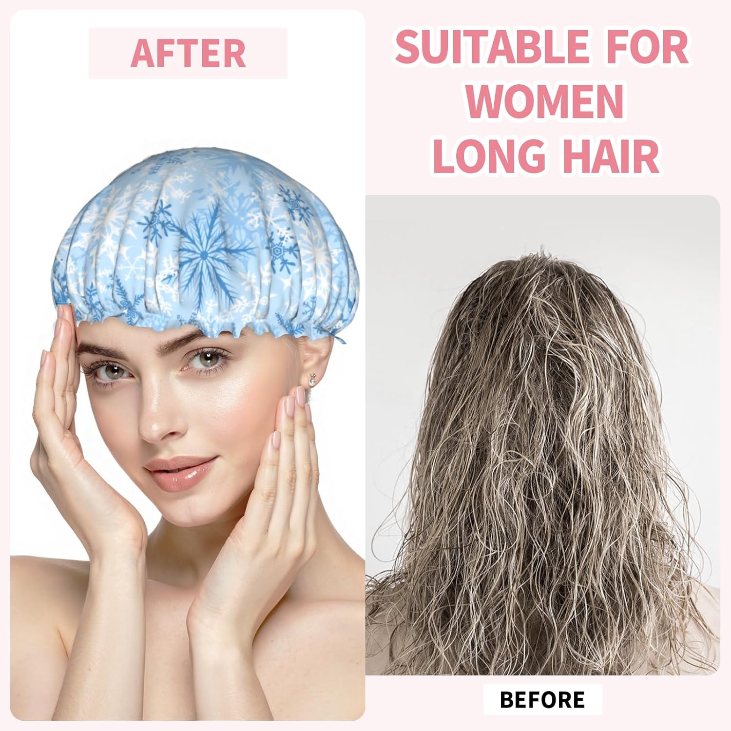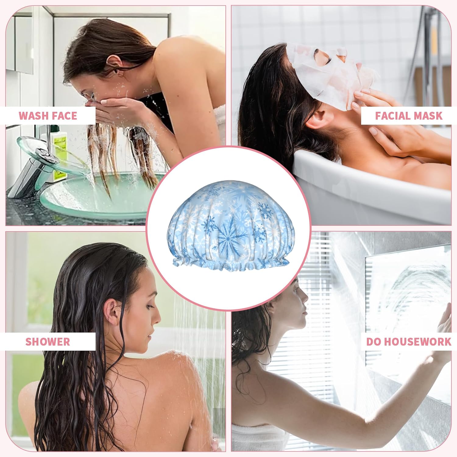 - Versatile Application: Our reusable winter blue snowflakes shower caps can be used for showering, cooking, household cleaning, and spa sessions, keeping your hair dry and protecting it from dust and cooking fumes. This winter blue snowflakes bath hair hat also fit for makeup, face washing, and applying facial mask, due to it suitable for all hair types-long, curly, voluminous or short, adding more convenience and beauty to your daily life.