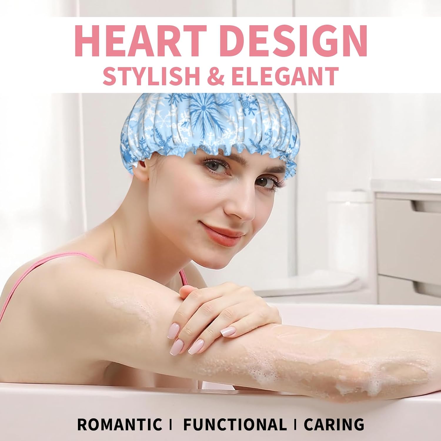 Winter Snowflakes Shower Caps Blue White Snowflakes Hair Caps for Shower Dual-Layer Waterproof Bath Hat Elastic Reusable Hair Hat for Shower Cooking Clean Makeup Travel