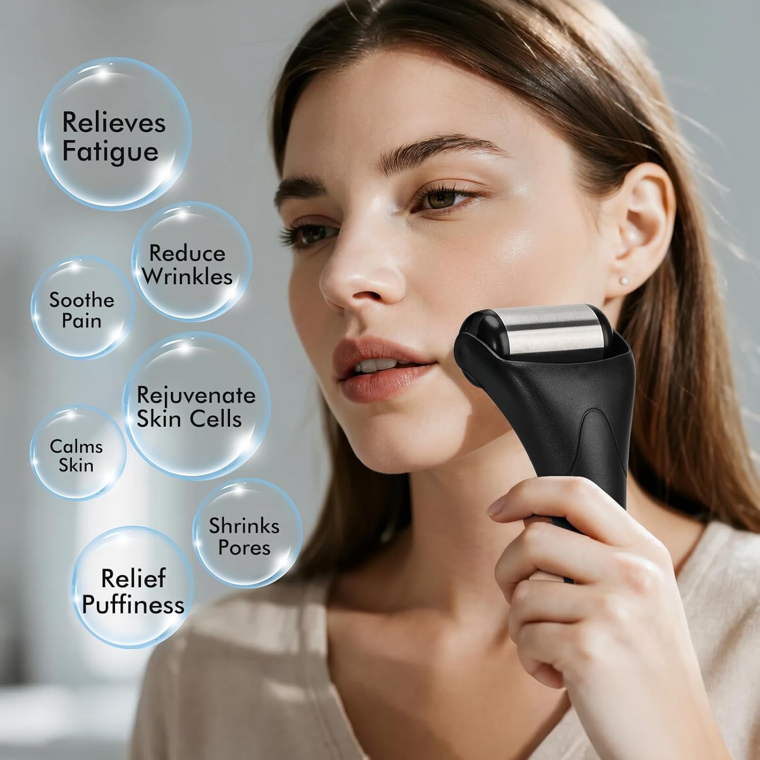 - COOLING SKIN - Using a facial roller to cool down skin can raise your spirits to work; Massage before makeup to eliminate facial and eye dropsy; Massage during mask caring to shrink pores and calm skin; Calm skin and reduce burns of skin after sun exposure; Prevent wrinkles and improve dry skin