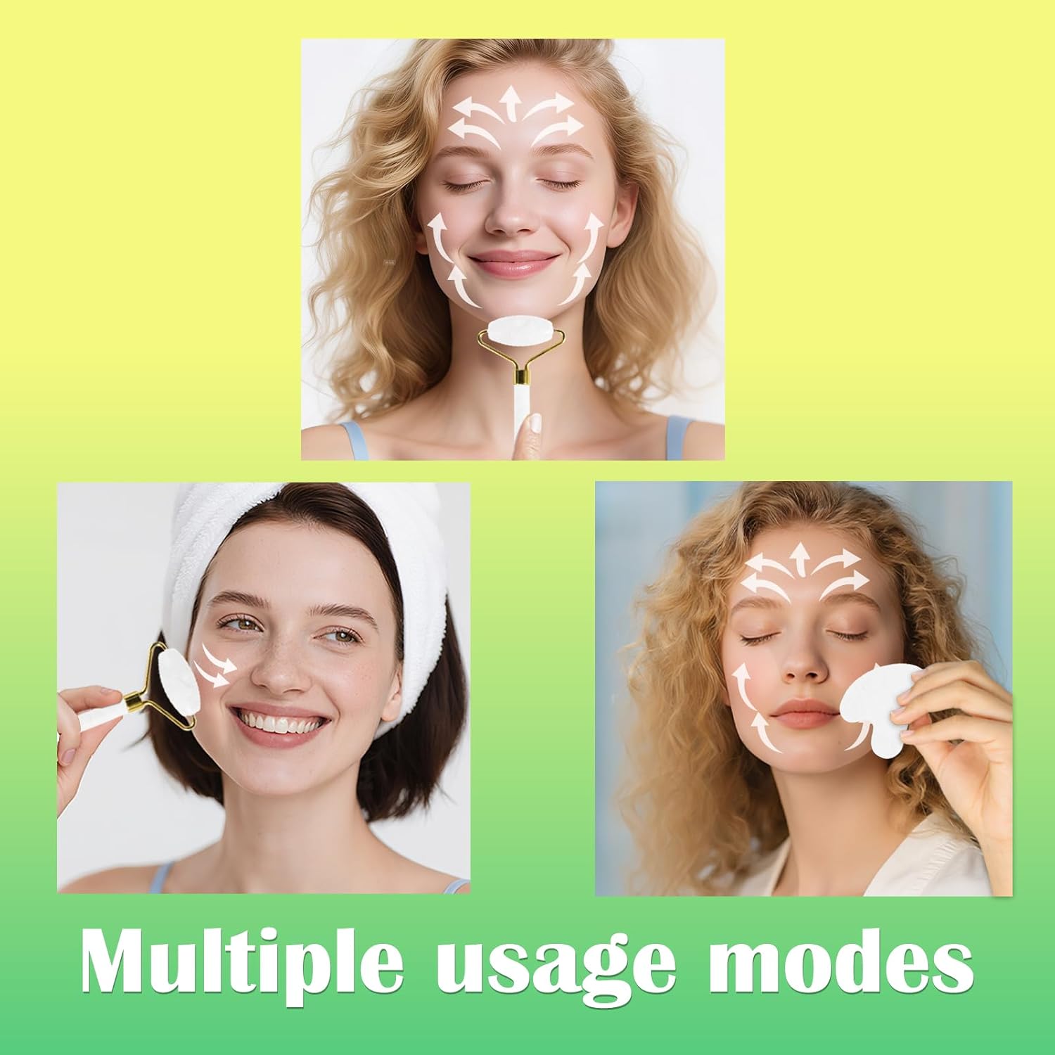 Jade Roller Gua Sha Tools - Nature Gua Sha Facial Tool Skin Tightening Face Massager Anti-Aging Jade Face Roller Puffiness Reducing Guasha Stone for Women Men (White)