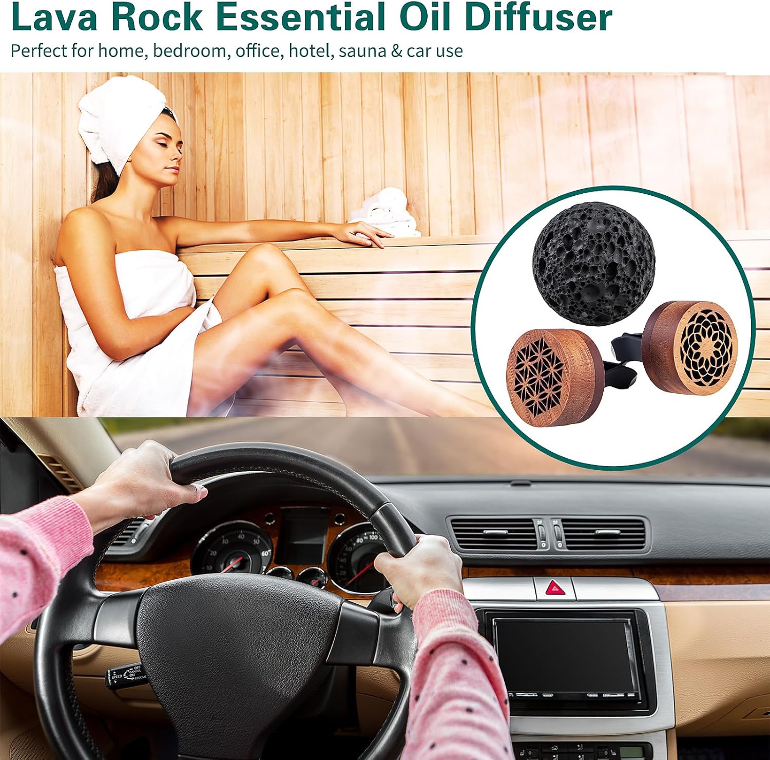 - 【Lava Rock Aroma Diffuser Set】1 spherical lava diffuser crafted from polished natural lava rock (2" diameter); 2 car essential oil diffusers made of premium bubinga wood and volcanic lava (Size: 1.38"×0.67").