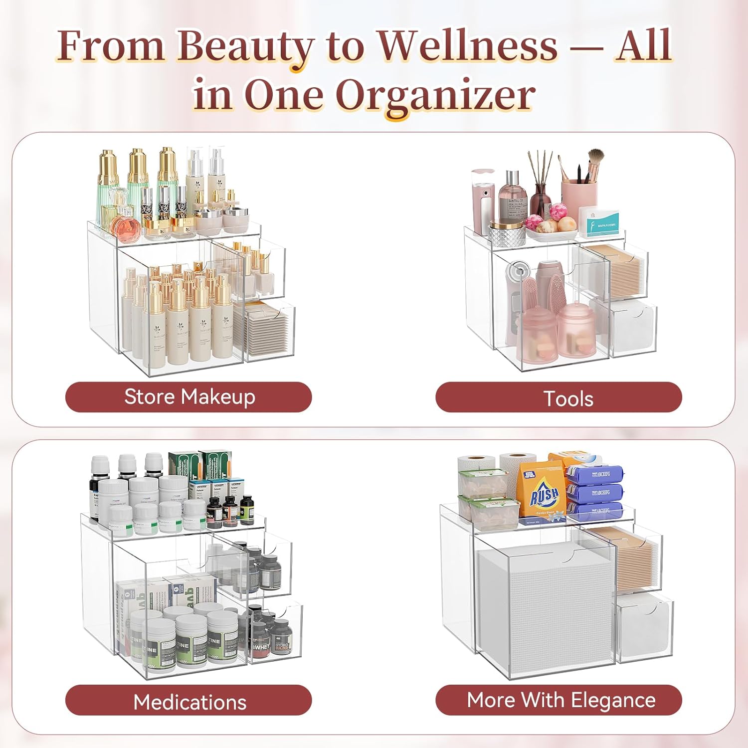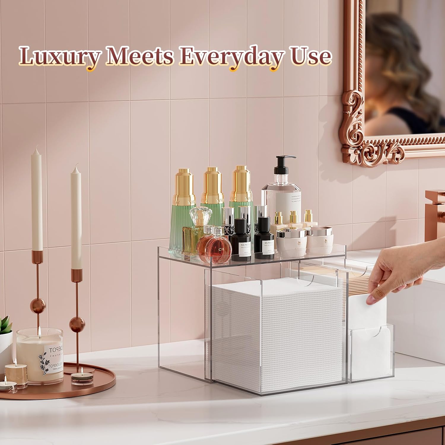 - 2. Clear Acrylic Drawer for Easy Access The smooth slide-out drawer makes this disposable face towel holder perfect for busy routines. Reach your face towels holder essentials quickly without disrupting your countertop setup.