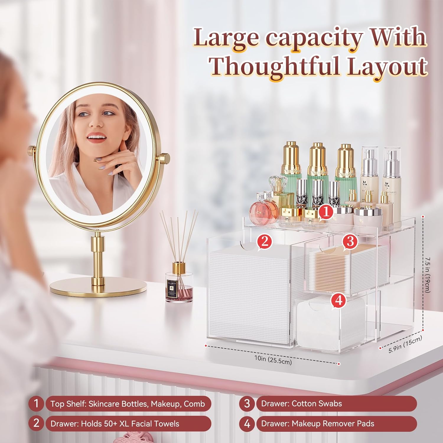 - Special Feature : 0.5-inch raised top border to secure items on top, High-transparency acrylic for a modern, clean look, Holds 50+ XL disposable facial towels (towels not included), Ideal for vanities and bathroom countertops, No installation required Smooth slide-out acrylic drawer for quick access 0.5-inch raised top border to secure items on top, High-transparency acrylic for a modern, clean look, Holds 50+ XL disposable facial towels (towels not included), Ideal for vanities a… See more