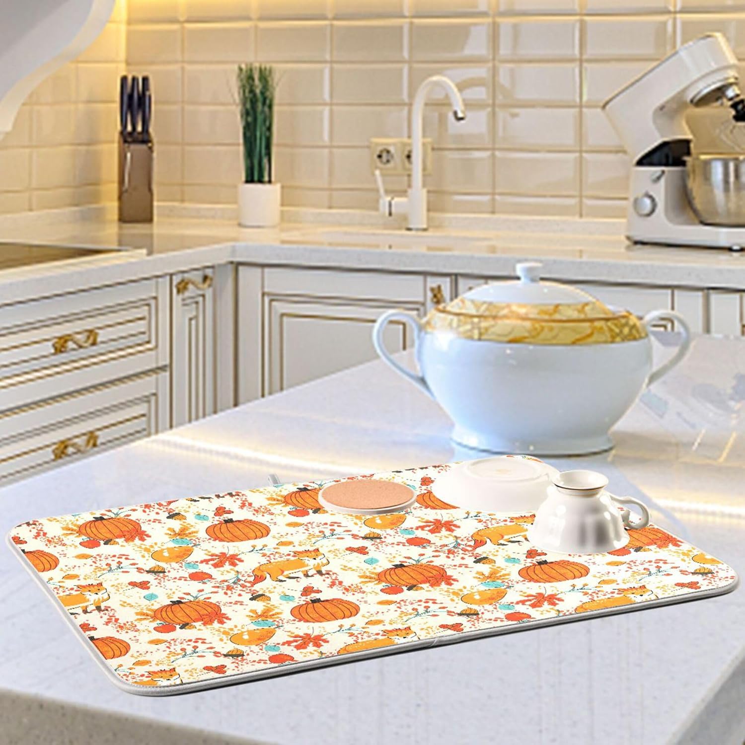 Fall Fox Dish Drying Mat for Kitchen Countertop 16x18 Autumn Chestnuts Pumpkin Berry Thanksgiving Day Small Drying Mat Reusable Quick Dry Dish Sink Mats Easy Clean Decorative Essentials