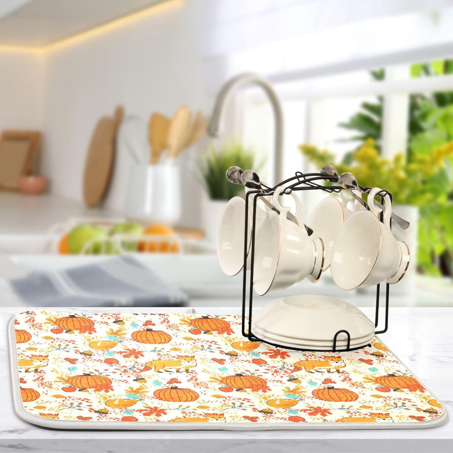 Fall Fox Dish Drying Mat for Kitchen Countertop 18x24 Autumn Chestnuts Pumpkin Berry Thanksgiving Day Large Drying Mat Reusable Quick Dry Dish Sink Mats Easy Clean Decorative Essentials