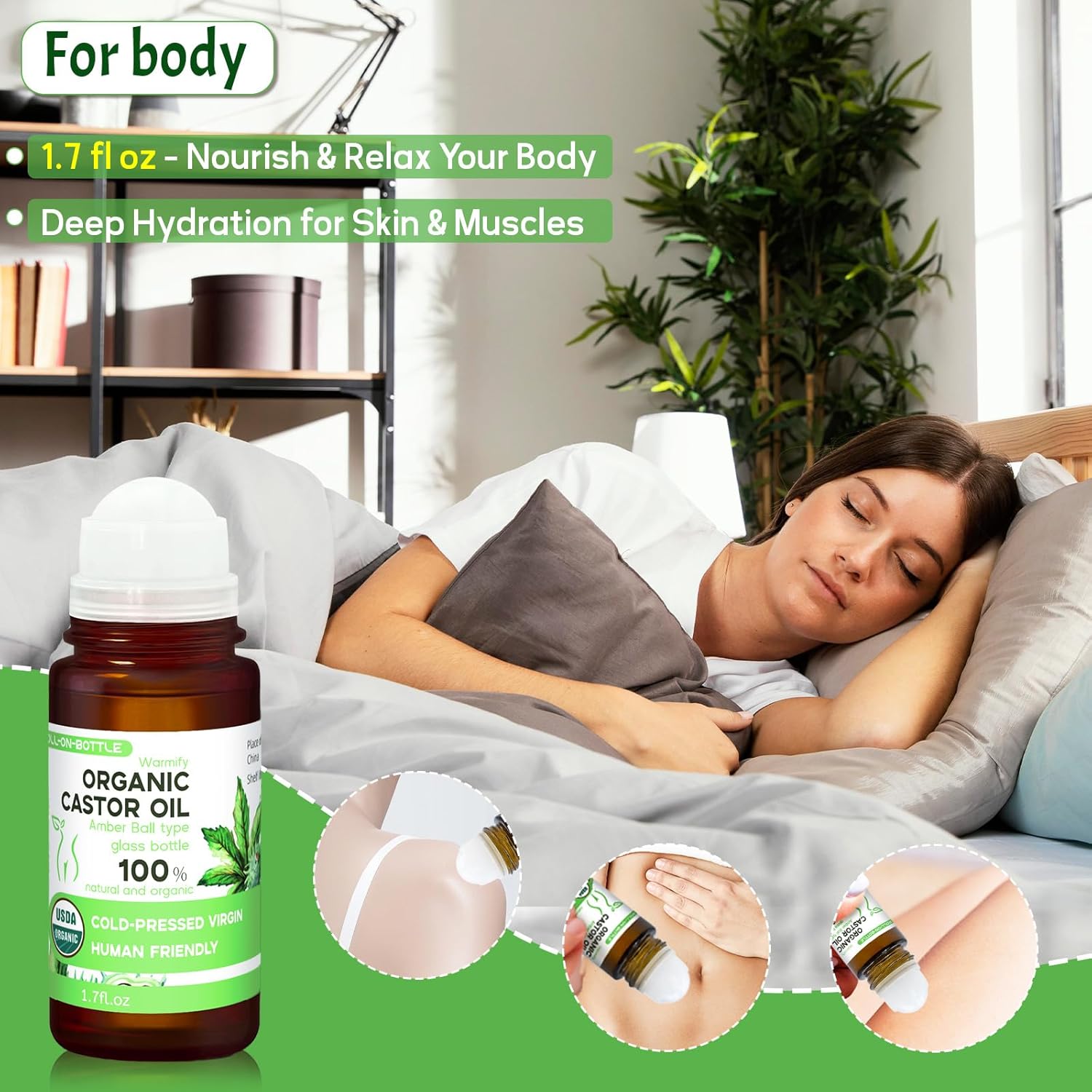 - CERTIFIED ORGANIC CASTOR OIL - Our roll on castor oil Made from pure,natural organic ingredients, cold-pressed and hexane-free to retain nutrients. Stored in UV-protective amber glass bottles for long-lasting freshness and application to eye,belly face, and body.