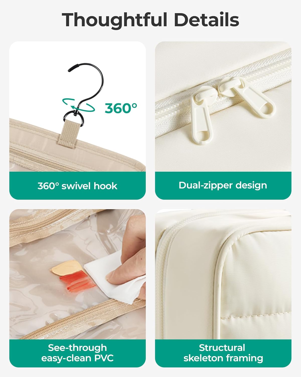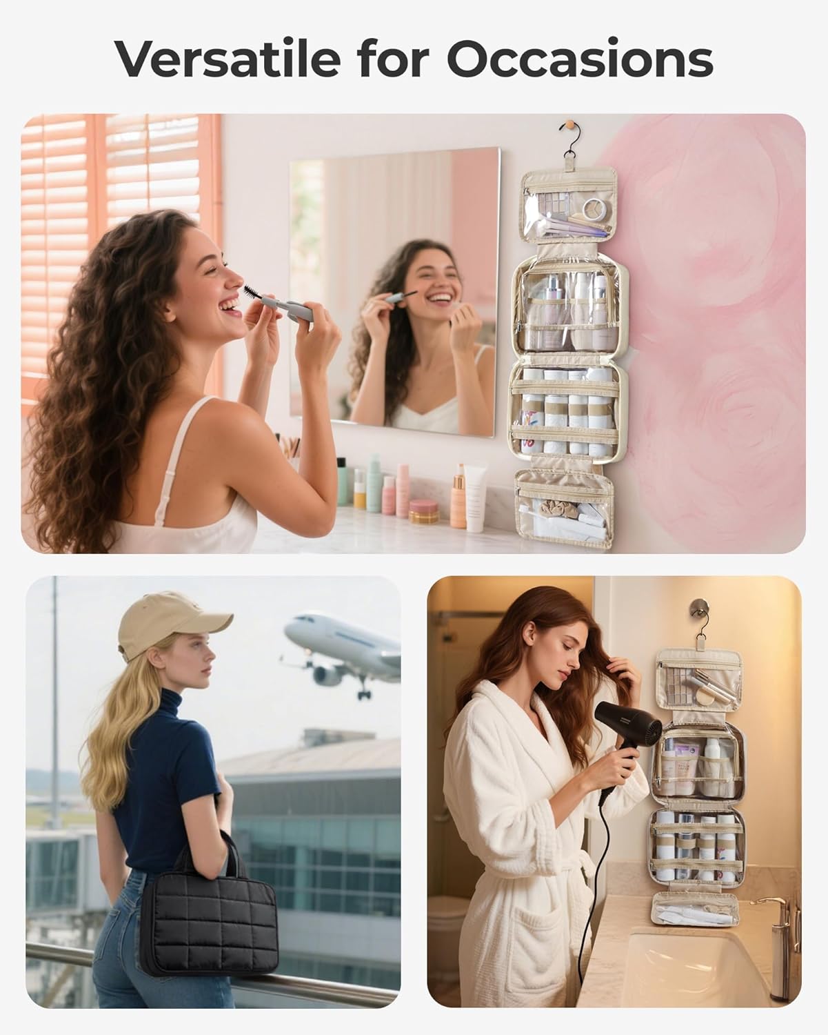 - ๐๐จ๐ง๐ฏ๐๐ง๐ข๐๐ง๐ญ ๐๐๐ฌ๐ข๐ ๐ง: Travel bag for toiletry stow-away 360-degree swivel non-slip metal hook for versatile hanging options, carry handle doubles as its hanging strap, two-way zipper closure for quick access