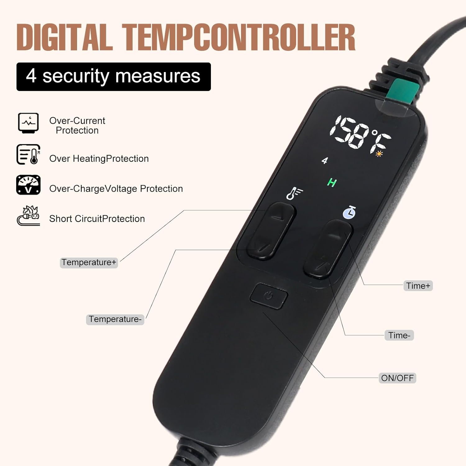 - 【Digital temperature controller】 (86 ° F~158 ° F): The temperature setting can be adjusted according to different preferences (86 ° F~158 ° F). The temperature controller is your guarantee for safe heating and has a safe automatic shutdown function. The digital temperature control has a selectable heating time of 1/2/3/4/5 hours. After the set heating time, the temperature controller will automatically power off.