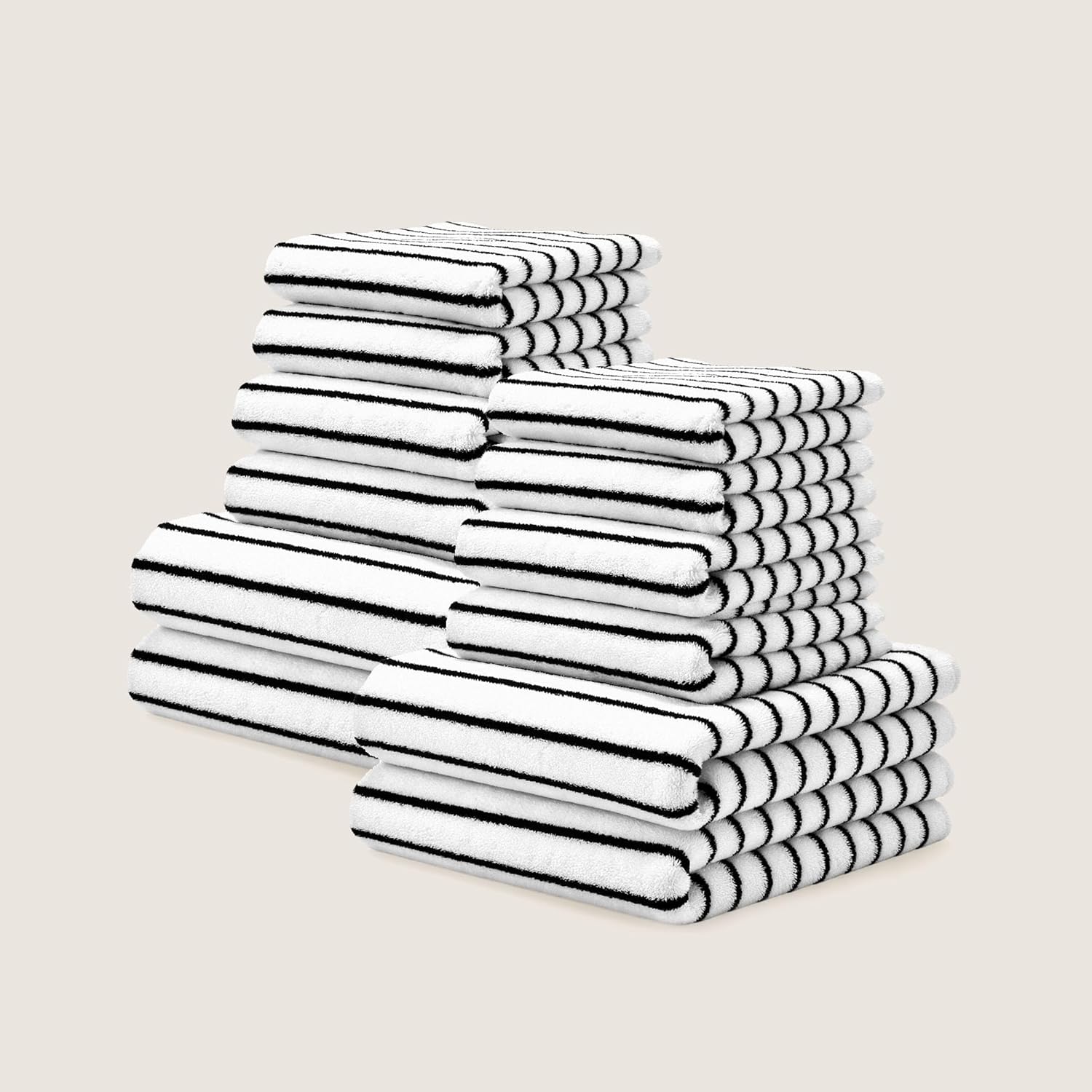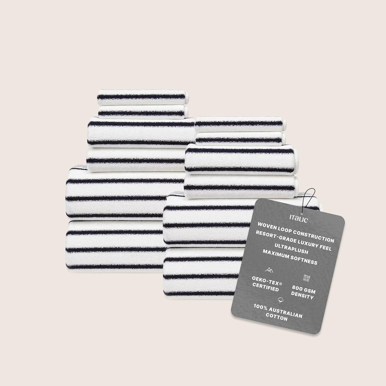 Italic Ultraplush 12-Piece Family Towel Set – Luxury Bath Towels, Hand Towels & Washcloths – Plush, Quick Dry, 800GSM 100% Australian Cotton for Bathroom & Spa - White & Blue (Striped)