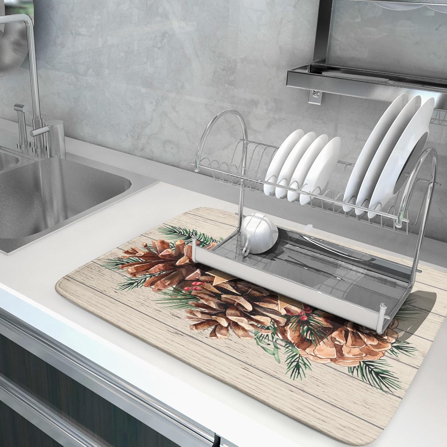 Winter Pine Cone Dish Drying Mat Holly Berries Dish Draining Mat Microfiber Washable Dish Drainer Rack Mat for Home Kitchen Counter 18"x24"