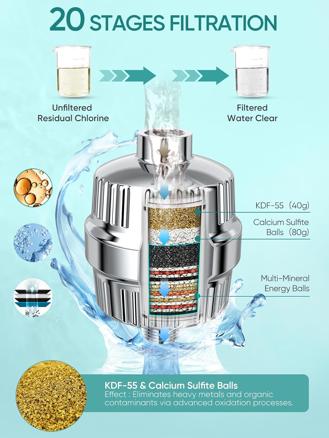 - Advanced Double Filtration System:Compared to a single filter,our advanced system integrates a 20 stage filter with a 16 stage shower head filter. This means every water molecule is purified not just once, but through an extensive 36-stage process. Both filters include KDF-55, which effectively neutralizes over twice the chlorine, removes heavy metals like lead and mercury. With a filtration efficiency exceeding 99.945% that approaches perfection, the result is water that is doubly pure and truly spa-like. Experience double the purity, double the softness.