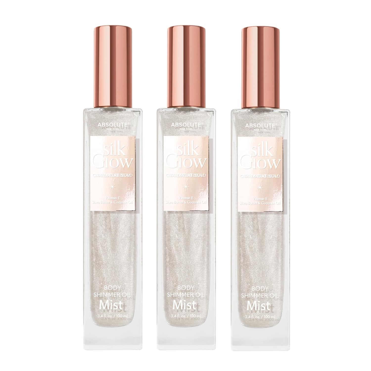 Absolute New York - Silk Glow Shimmer Mist Glow, Radiant, Shimmer Body & Face & Hair, Shea Butter, Coconut Oil, Vitamin E (SBGS01 White Plantinum Mist (Set of 3), 3.4 fl oz)