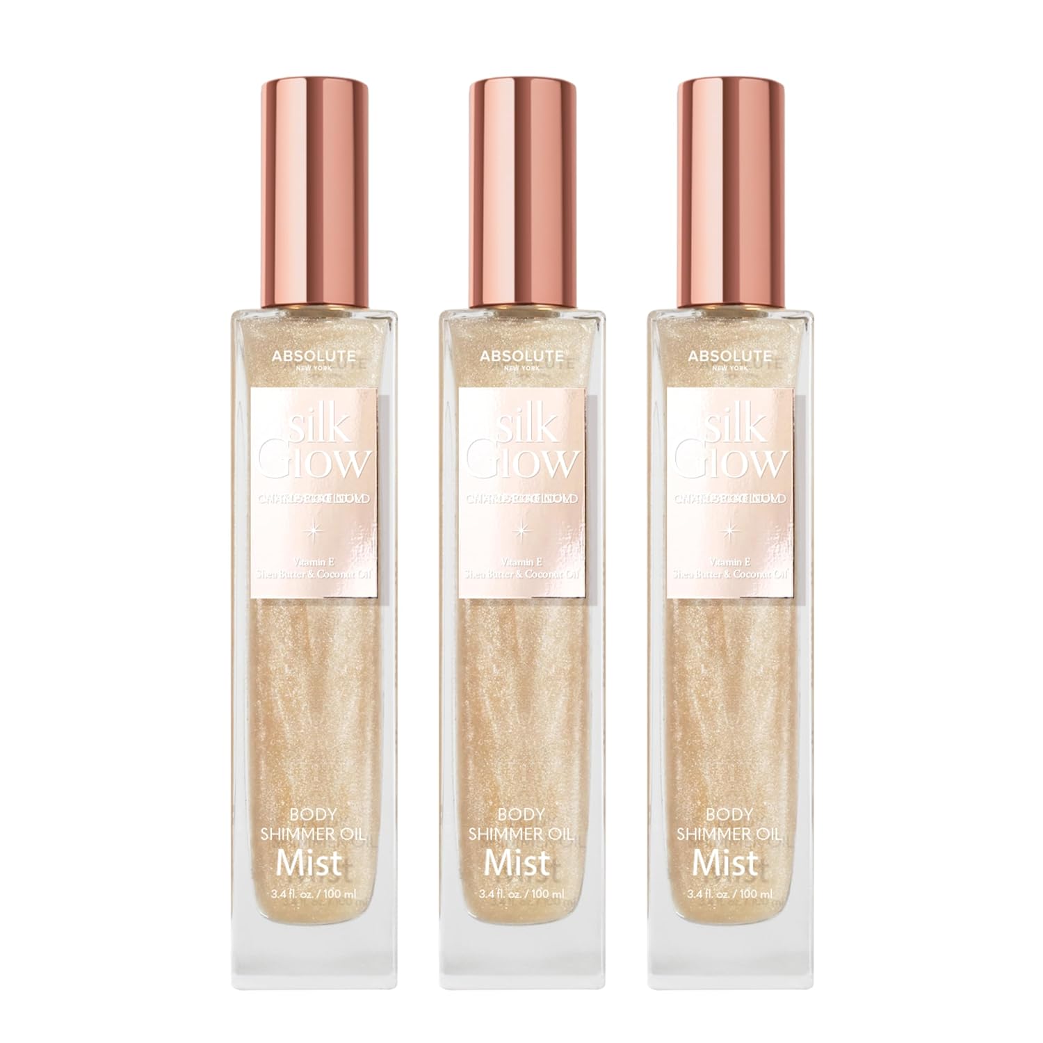 Absolute New York - Silk Glow Shimmer Mist Glow, Radiant, Shimmer Body & Face & Hair, Shea Butter, Coconut Oil, Vitamin E (SBGS03 Chanpagne Gold Mist (Set of 3), 3.4 fl oz)