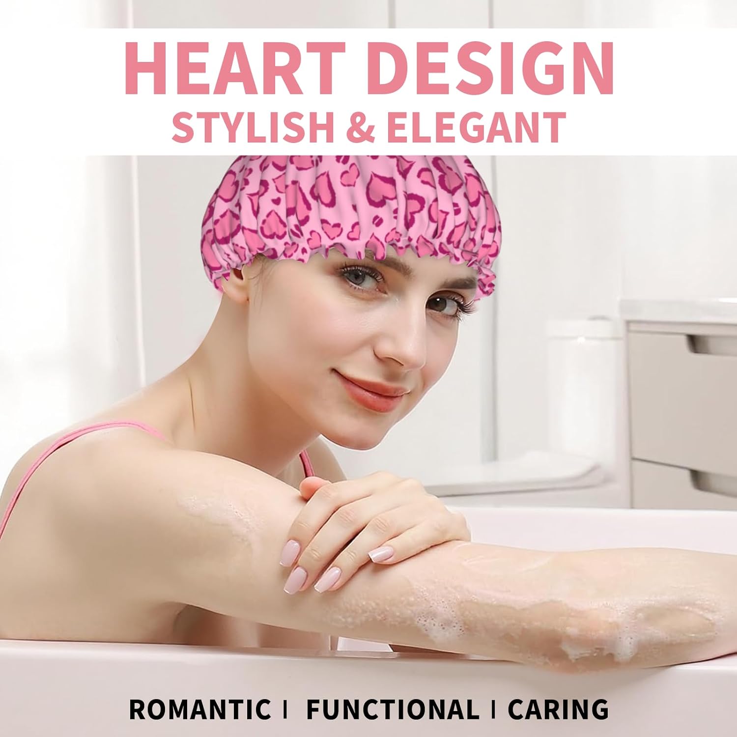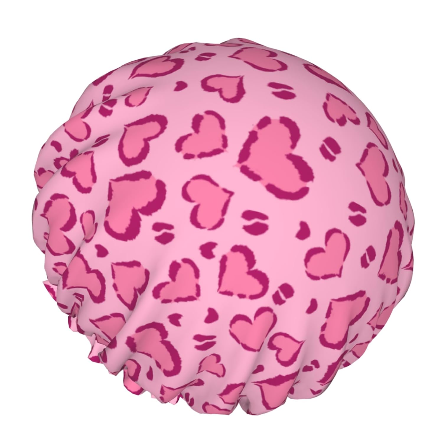 Hot Pink Shower Caps Heart Leopard Print Dual-Layer Waterproof Bath Hat Reusable Hair Caps Elastic Hair Hat for Shower Cooking Clean Makeup Travel
