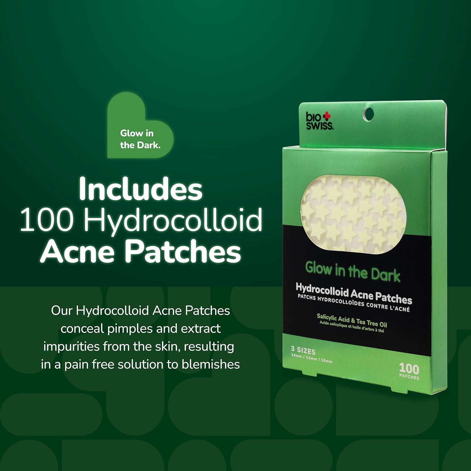 BioSwiss Pimple Patches, Glow in the Dark Patch for Zits and Blemishes, Hydrocolloid Spot Stickers for Face and Skin, 100 Count