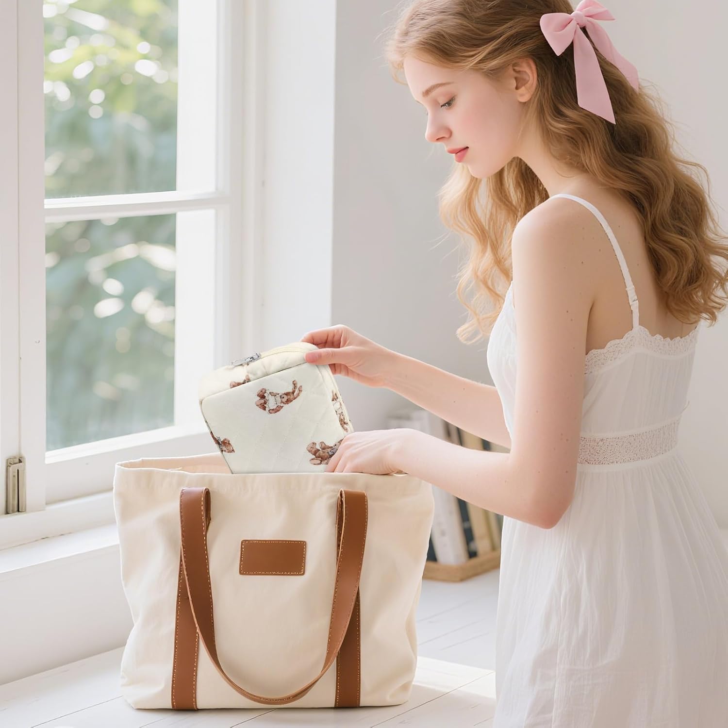 Small Quilted Cotton Makeup Bag for Purse Mini Cosmetic Period Bag for Women Cute Small Bear Makeup Sanitary Pouch Portable Travel Toiletry Bags with Zipper Slip in Pockets Birthday Gifts