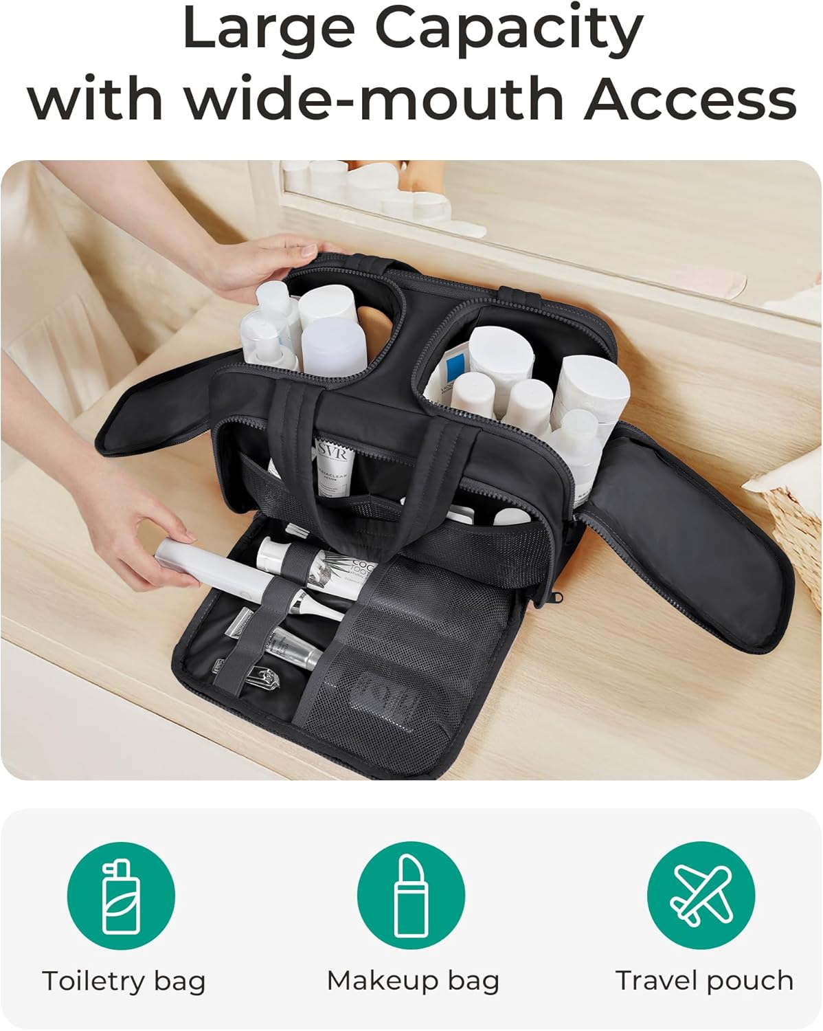 - Easy Access and Keep Upright : Full opening and not piling up for easy access to items. Double side full open design of travel bag for toiletries keeps cosmetic bottles and toiletries can stand upright in the middle compartment. Avoid leakage during transit