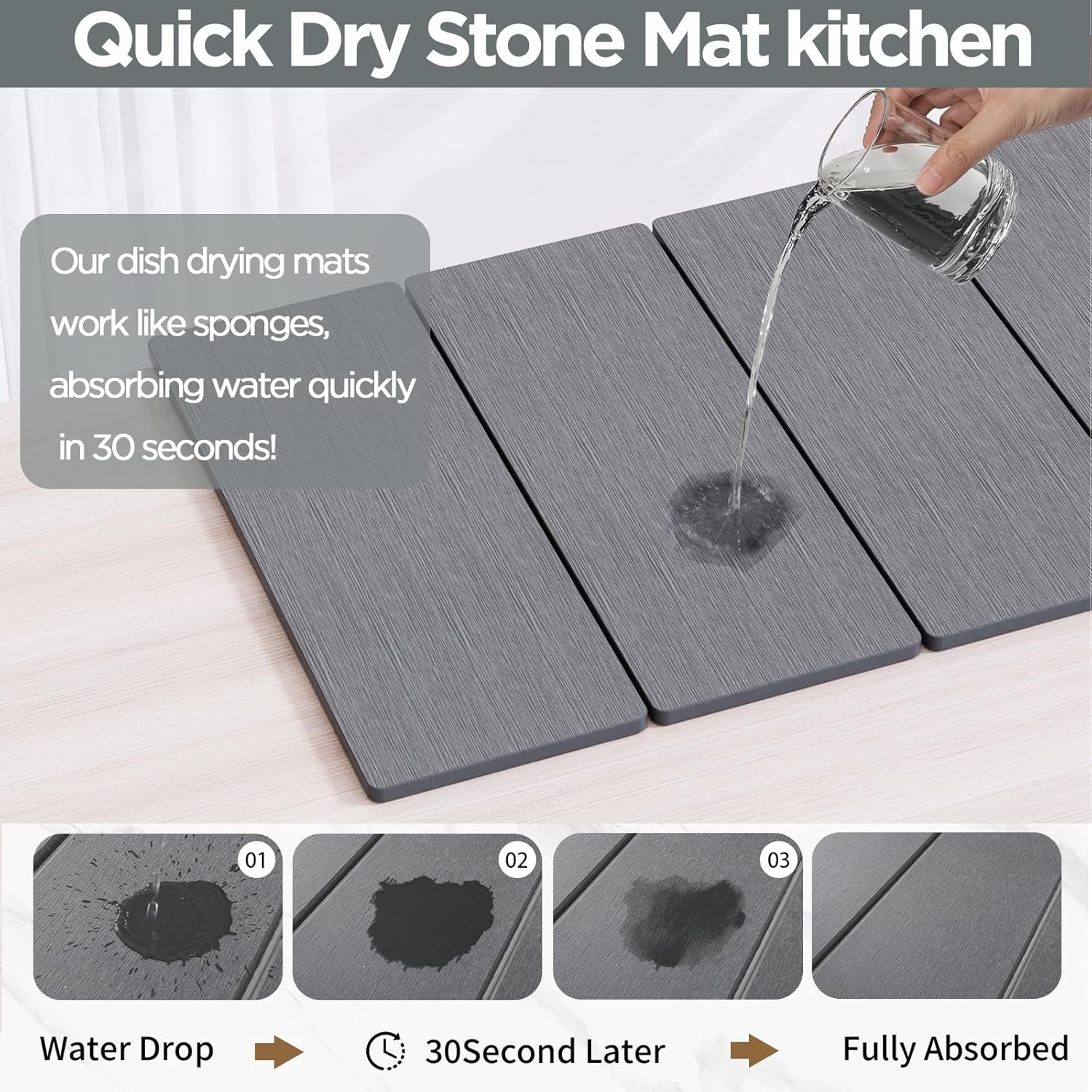 - 【Super Absorbent & Fast Drying Stone Mat】Crafted from natural diatomaceous earth and reinforced with durable PVC, our stone drying mat instantly absorbs water like magic! Its microporous structure accelerates evaporation, leaving your countertops flawlessly dry and spotless. No more puddles or stains—just a sleek, sustainable solution for your daily routine.