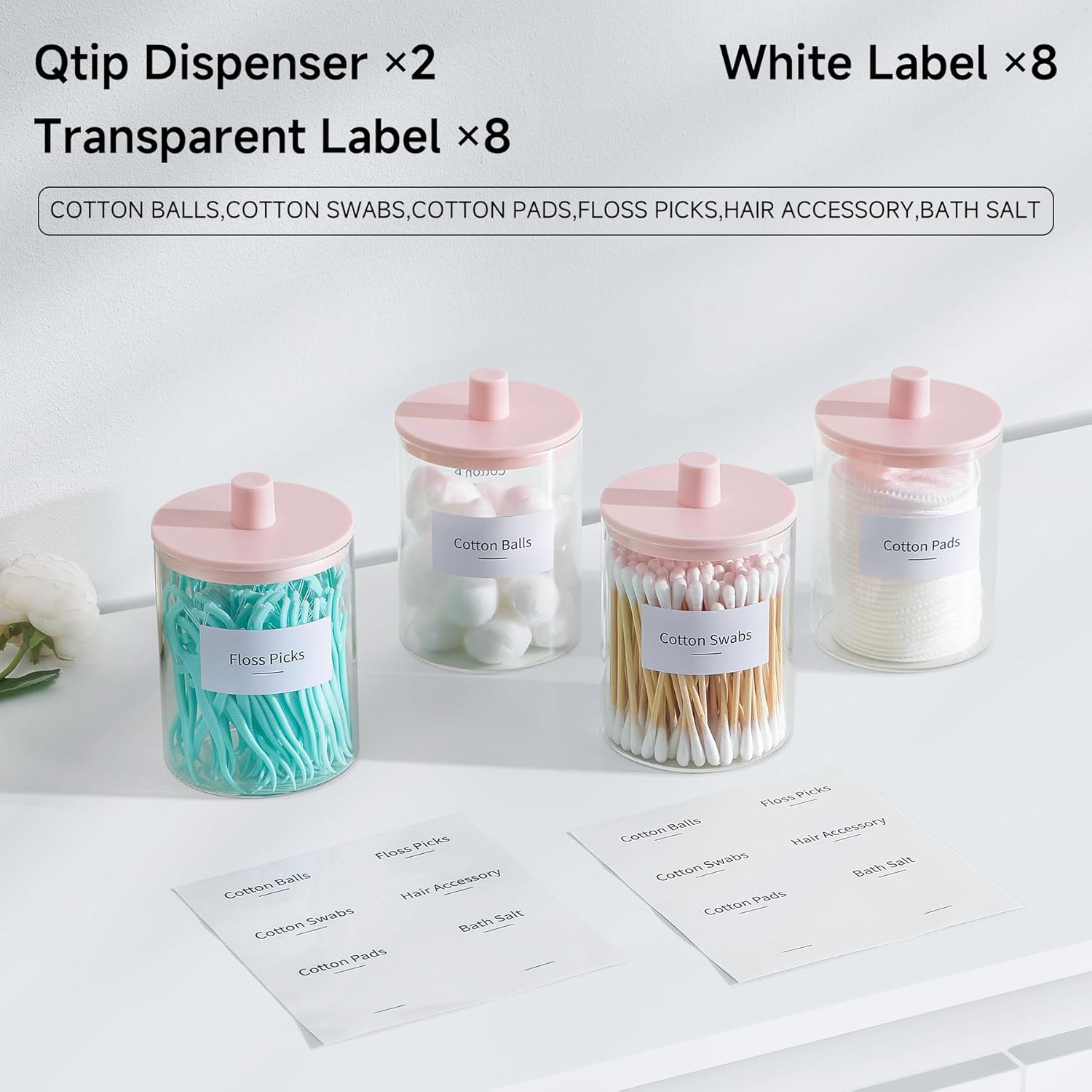 - What’s Included: 2 Glass q tip holder dispensers with lids + 8 transparent labels +8 White Labels