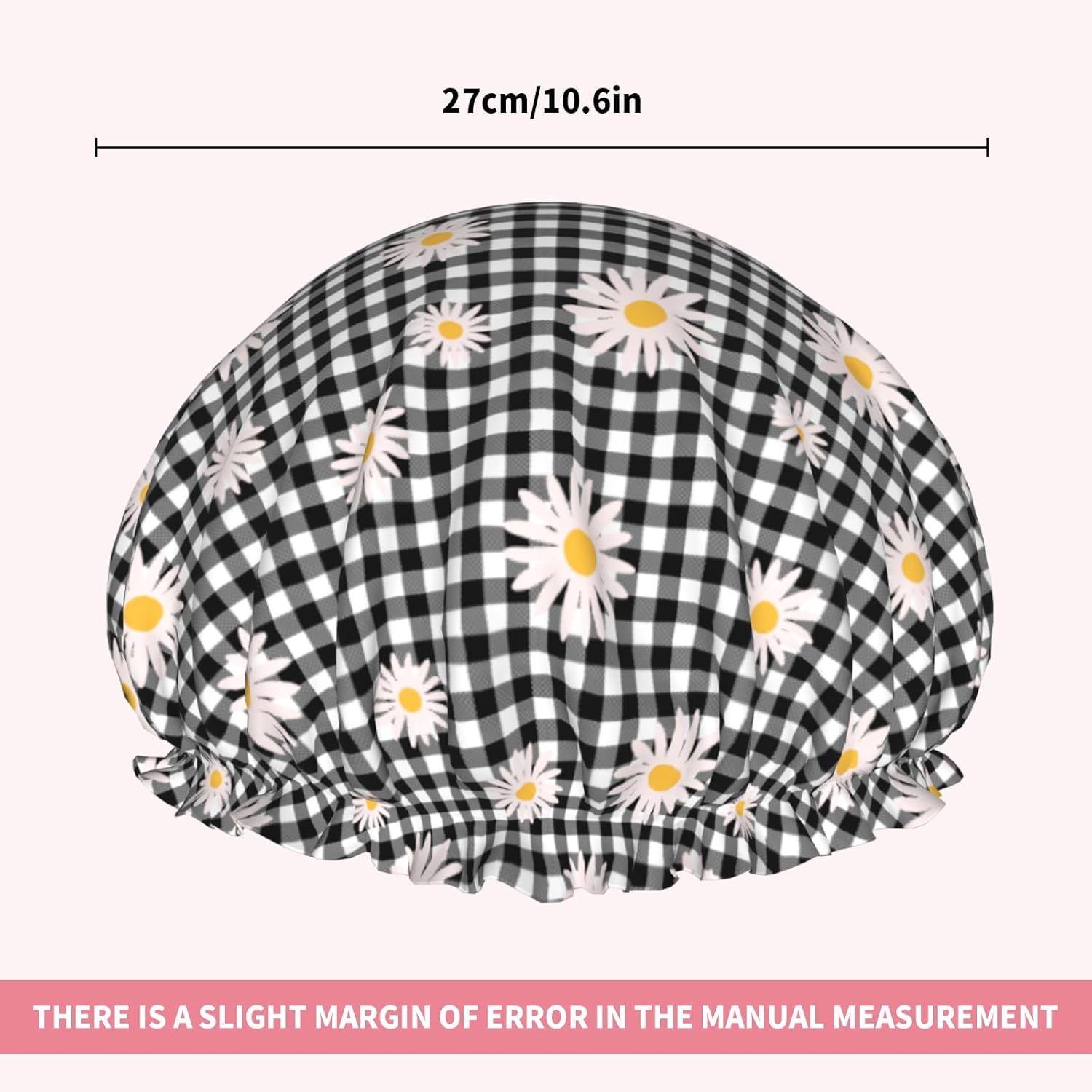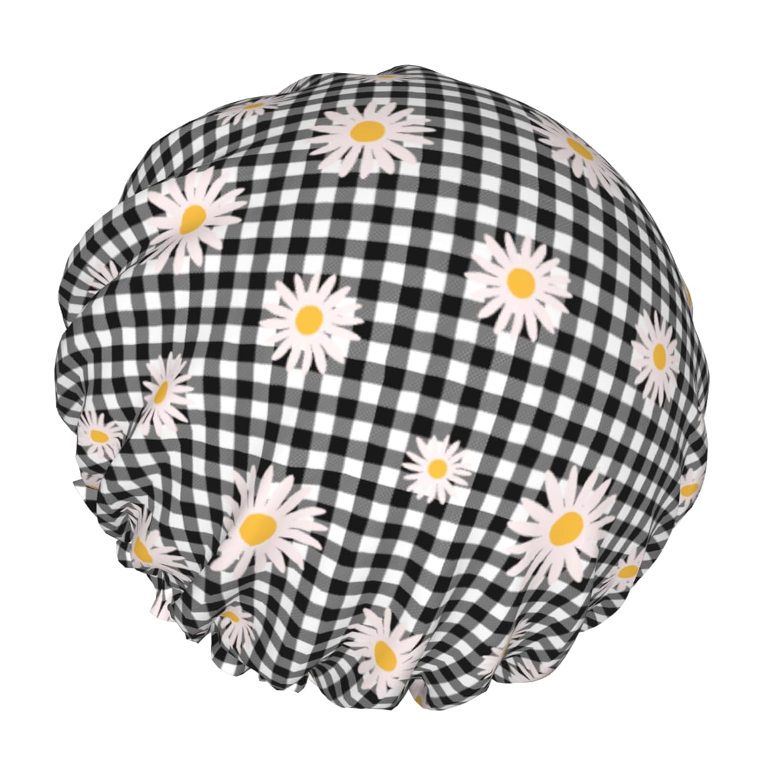 Daisy Shower Caps Black Checkered Dual-Layer Waterproof Bath Hat Flower Reusable Hair Caps Elastic Hair Hat for Shower Cooking Clean Makeup Travel