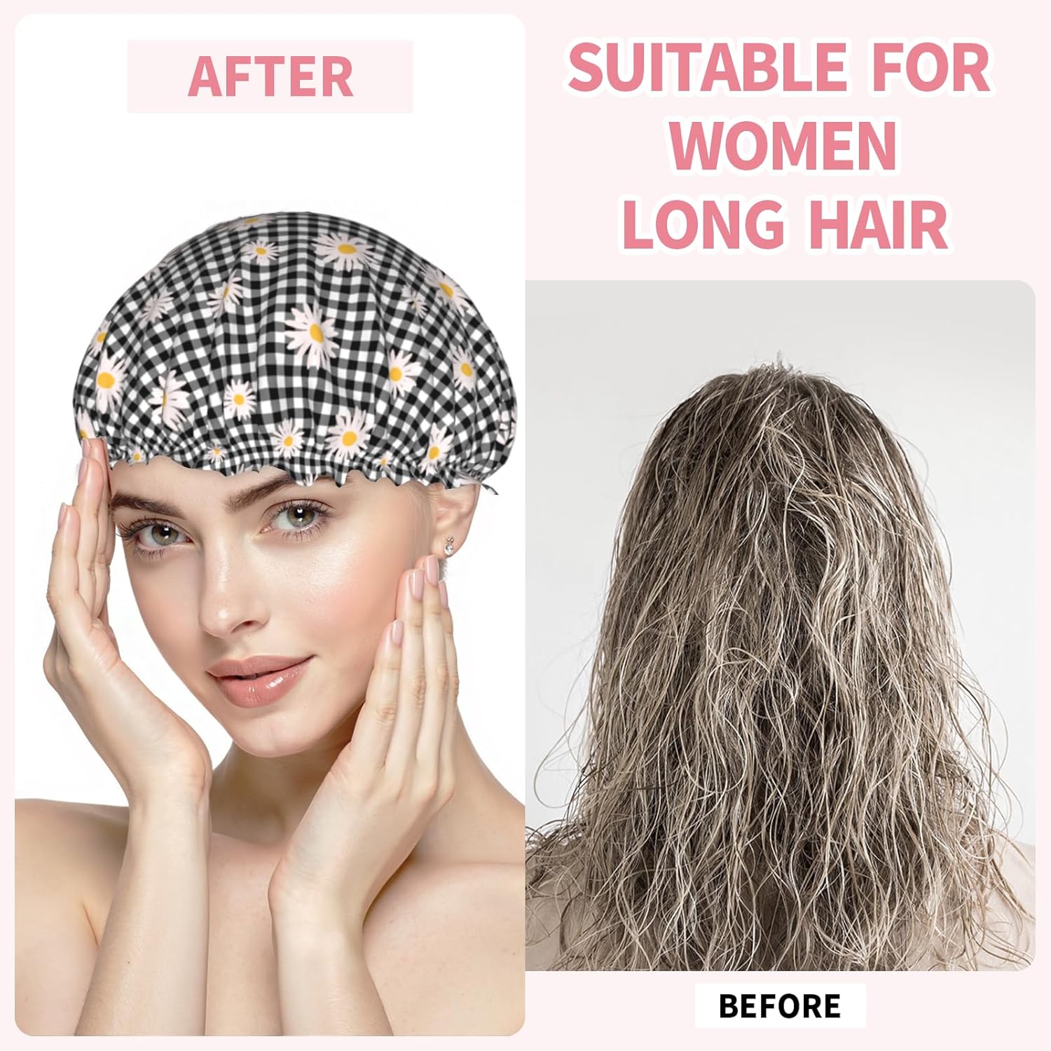 - Versatile Application: Our reusable daisy flower black checkered shower caps can be used for showering, cooking, household cleaning, and spa sessions, keeping your hair dry and protecting it from dust and cooking fumes. This daisy flower bath hair hat also fit for makeup, face washing, and applying facial mask, due to it suitable for all hair types-long, curly, voluminous or short, adding more convenience and beauty to your daily life.